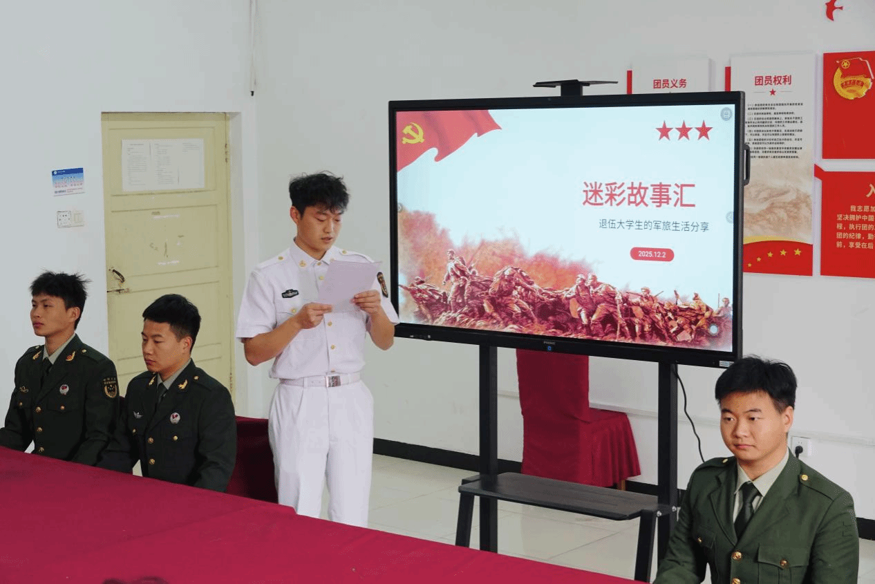 两位退役复学老员工结合自身经历,分享了军营生活的收获与蜕变。曾服役于陆军某部的王同学详细介绍了国家面向老员工士兵实施的“全程化”优待政策,包括入伍激励、学业保障、升学就业扶持等,真切展现政策对青年成长成才的支持作用。来自海军舰艇部队的李同学借助视频与讲解,生动再现部队实战化训练场景与专业技能学习经历。他谈到,军营不仅是锻炼体魄、磨砺意志的地方,更是学习高新知识、培养复杂环境下解决问题能力的“实践课堂”,这段经历使他在返校后更具竞争力和适应力。两位分享者不约而同地表示,军旅生涯最深刻的收获在于精神层面的成长——铁一般的纪律塑造了对党忠诚、听党指挥的政治品格,艰苦环境的锤炼培育了不怕困难、永不放弃的顽强韧性,强烈的使命感和集体荣誉感已成为他们终身受益的宝贵财富。
