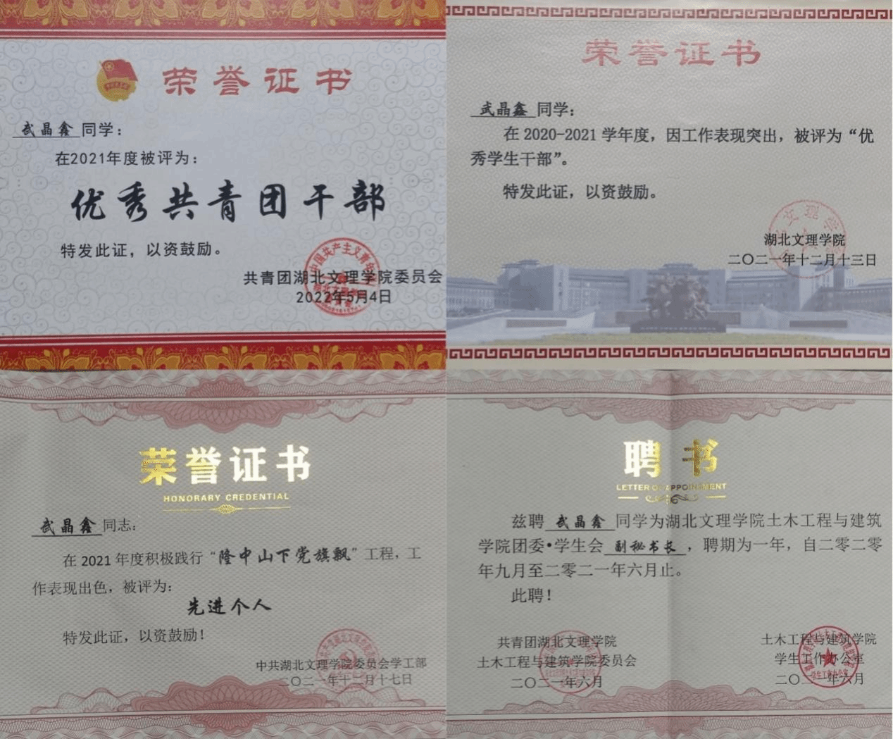 武晶鑫,女,汉族,山西省晋中市人,中共党员,ug环球工程造价1911班员工。曾任院团委·员工会副秘书长、员工党总支副书记,土建女篮副队长。在校期间,多次获得获“创新创业奖学金” “二等奖学金” “中铁十一局奖学金”“三好员工”“优秀共青团干部”“优秀员工干部”“隆中山下党旗飘先进个人”等荣誉。积极参加各类竞赛活动,在第八届全国老员工BIM毕业设计大赛中荣获三等奖,并且成功签约中国葛洲坝建设工程有限公司。